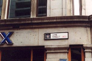 Fleming in the City of London Business Area at Lime Street. The building in the middle (with the for sale signs) is one of the first
