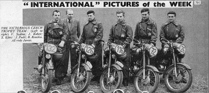 Right: The Victorious Czech Tropy Team (Left to right) V Sedina, J Kubes, S Klinu, J Pudil, B Roucka all rode Jawa's