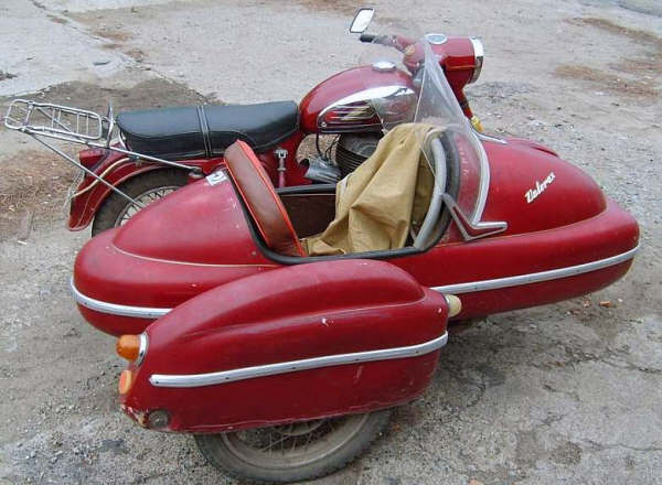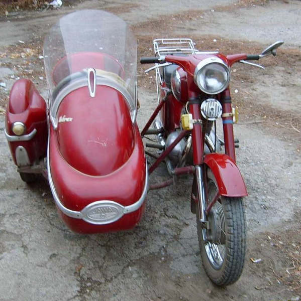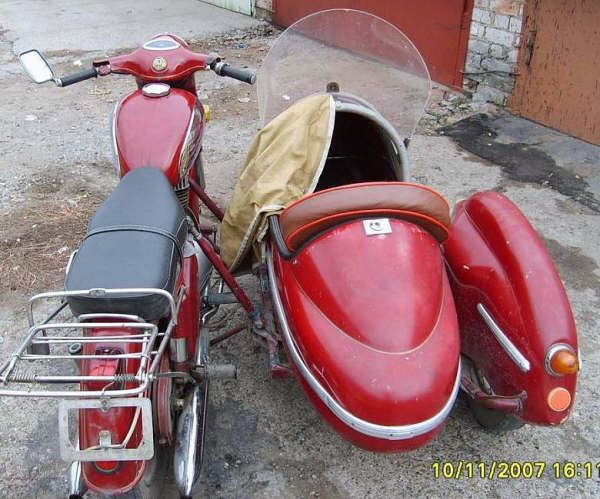 A 1959 Jawa 350cc attached to a hideous sidecar.